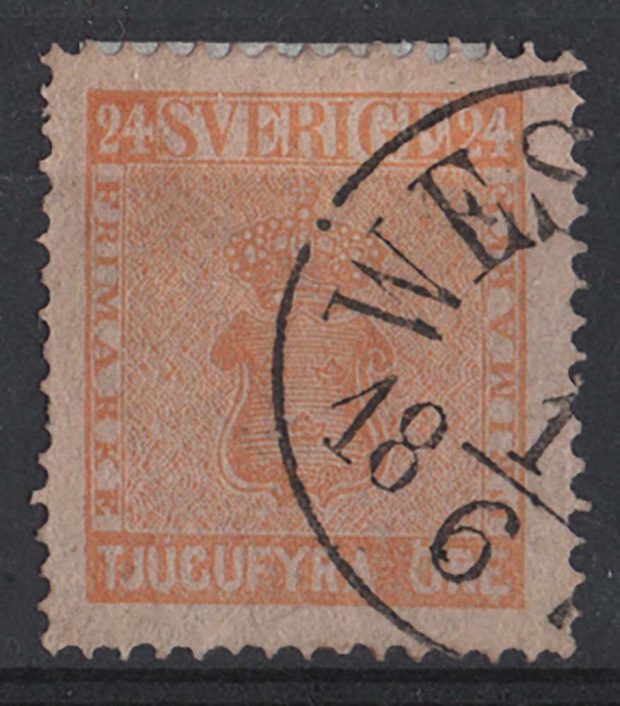 Sweden 1858 24ö orange sg9 fine used, crisp cancel well-centred, odd nibbled perf [ref 291-971/sa/ai1013]