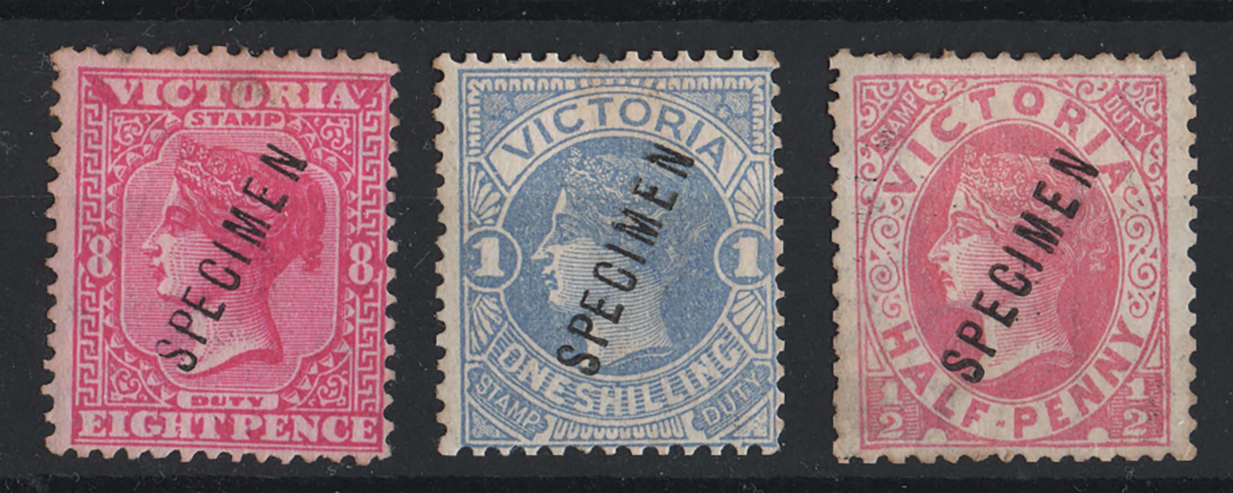Victoria 1885 8d rose/pink, 1s dull blue/lemon, ½d pale rosine ovpt Specimen fine unused sg293-4, 296 [ref 291-989/sa/ai0562]