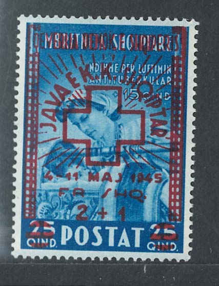 Albania 1945 Red Cross Week 2f + 1f on 25q +15q blue um, sg428, £38 ‡ [ref 27455/sa/y71488], Eastern Europe