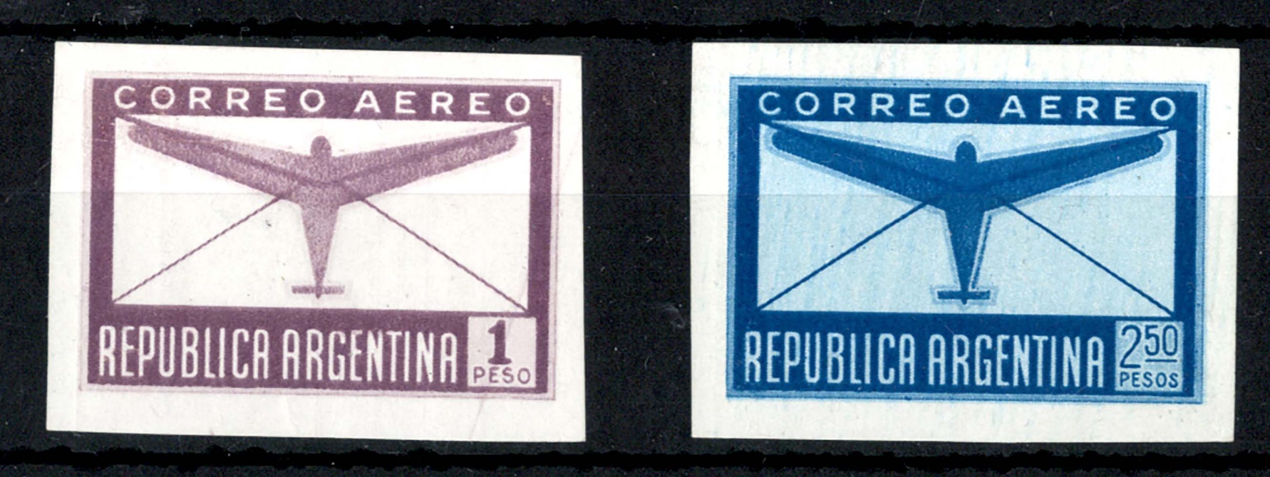 Argentina 1940 Airs 1p & 2p50 imperf ?colour trials or proofs in brown and blue