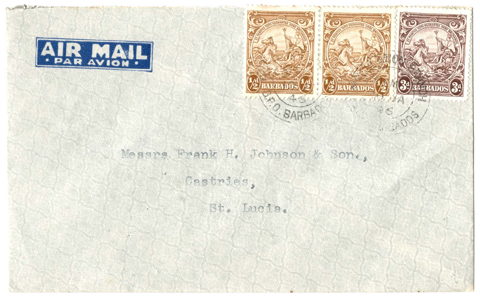 Neat Barbados 1946 Airmail cover from Bridgetown to Castries, St Lucia franked 2 x 1/2d + 3d, fine