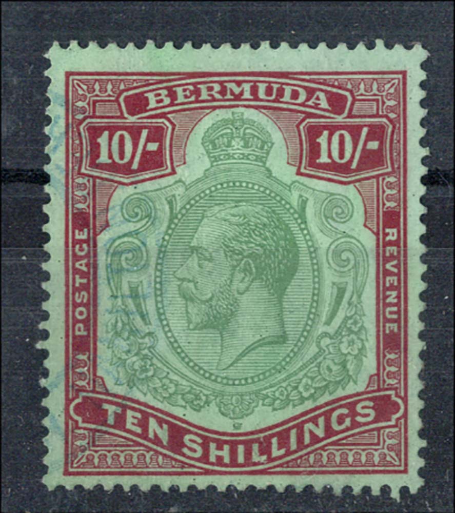 Bermuda 1921 10s Green & Carmine/Pale Emerald vfu sg92 cancel probably fiscal, c£250 as postal used (287/115 9i0449 saE)
