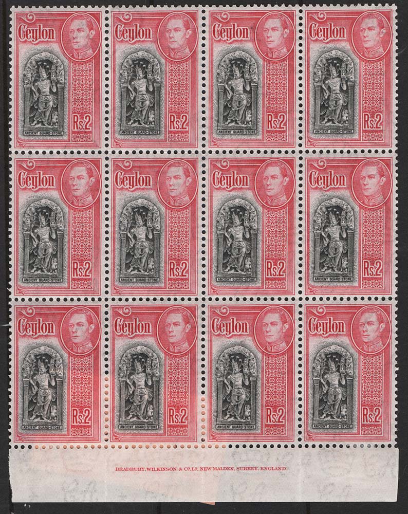 Ceylon 1938 2r black & carmine sg236 f mint imprint blk of 12 (10x um) c£252 [ref 287bb219/le/9s0143]