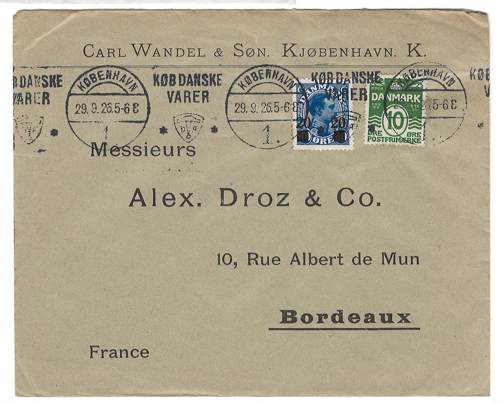 Denmark 1926 20 on 40ö blue fine used (with 10ö) on neat printed cover to Bordeaux Fa176 sg230 cat £18 as used [ref: 292/118 sED/7m0814]