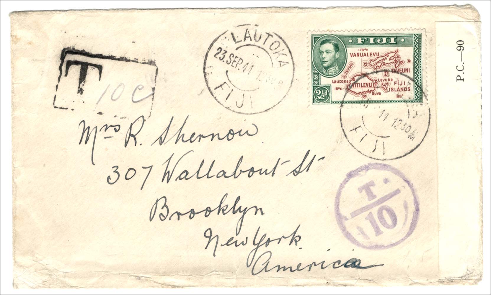 Fiji 1944 Neat censored underpaid cover to USA, 2½d vfu, Lautoka cds, 2x tax h/stamps