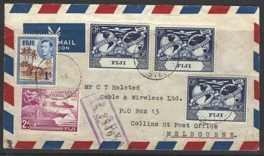 Fiji 1949 Neat commercial reg airmail cover to Melbourne franked UPU 2d, 3x 3d + 1d defin