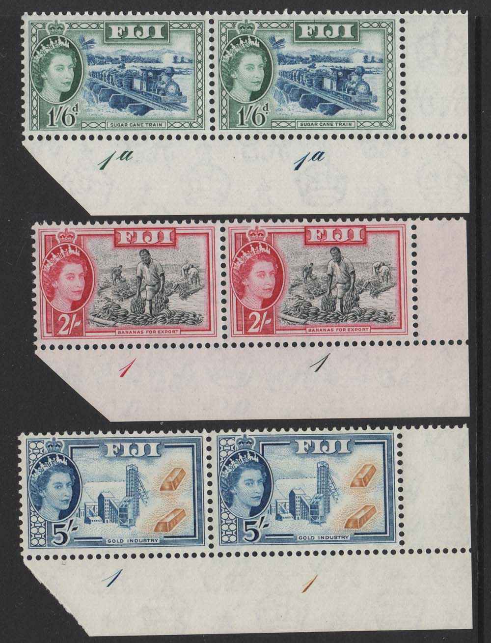 Fiji 1954 1/6d, 2s, 5s corner pairs (1/6d Plate 1a1a, 2s, 5s plate 1-1)