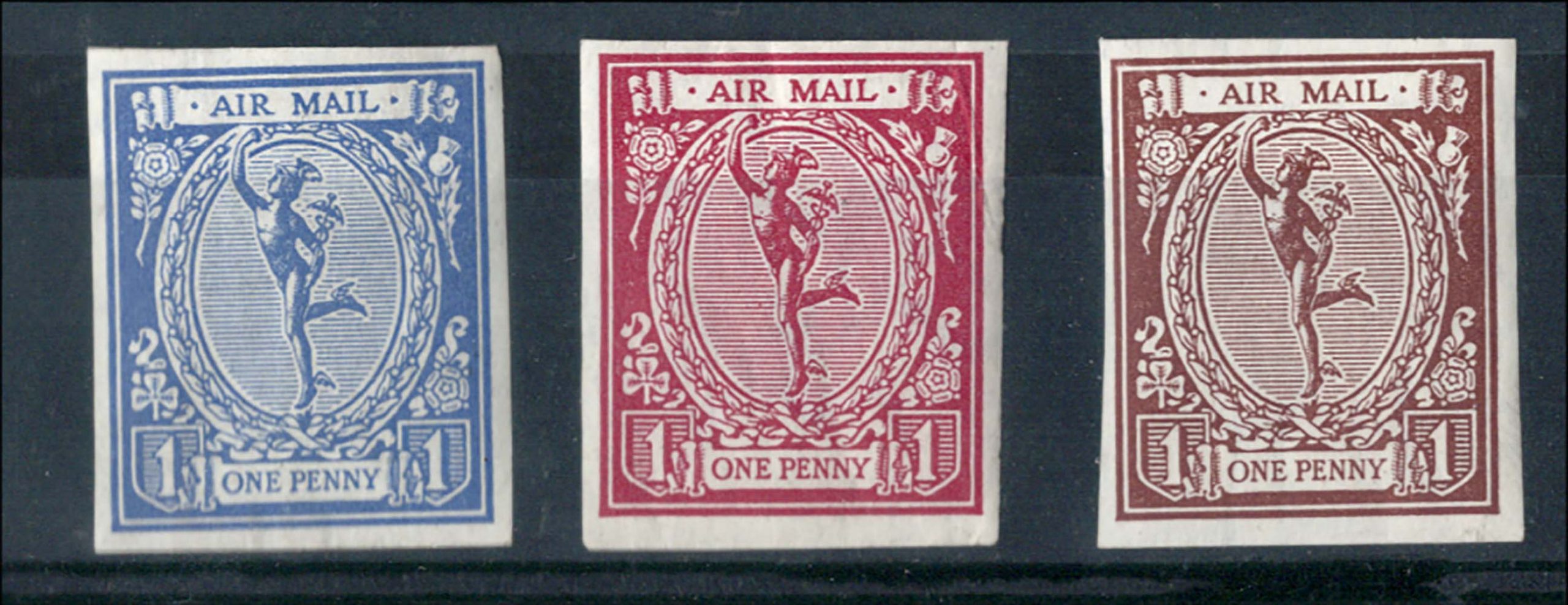 GB 1911 De La Rue imperf Mercury Air Mail essay, minor wrinkle, in blue, red & brown unmounted mint [3] [ref: 292/349 sa/9i0082]
