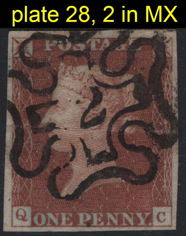GB 1841 1d red plate 28 QC vgu 4 large margins crisp ‘2 in MX’ horiz crease cat £160 [ref 288/sa/ac0356] Victoria Line-Engraved Issues