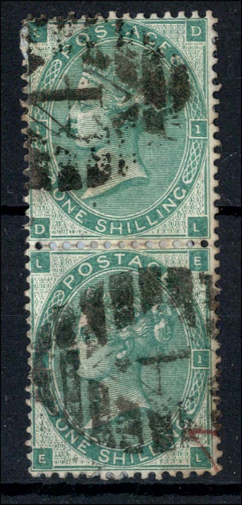 GB 1862 1s deep green sg89 vgu pair, partly on piece, ‘4’ numeral and part red transit c£1000