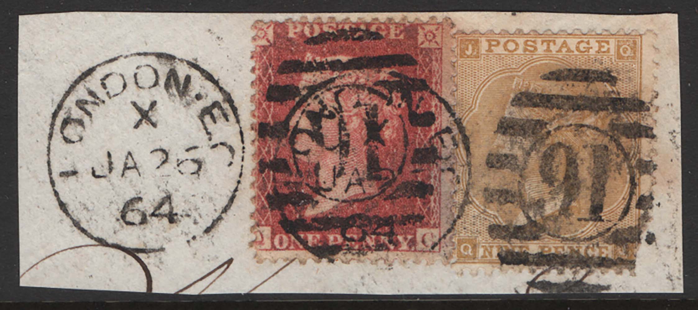 GB 1862 9d straw sg87 vgu on piece with 1d star, London 1864 ’81’ duplex c£475+