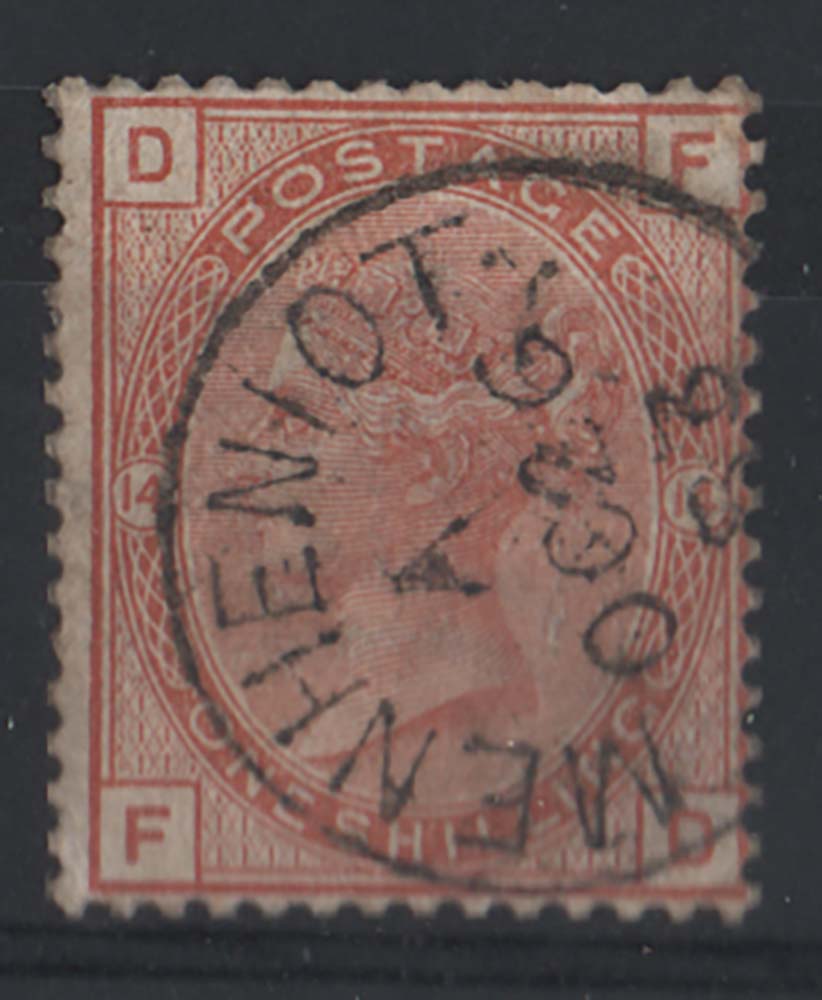 GB 1880 1s plate 14 vfu, crisp MENHENIOT cds, a few nibbled perfs sg163 c£140 [ref 287a/sae/9o0099]