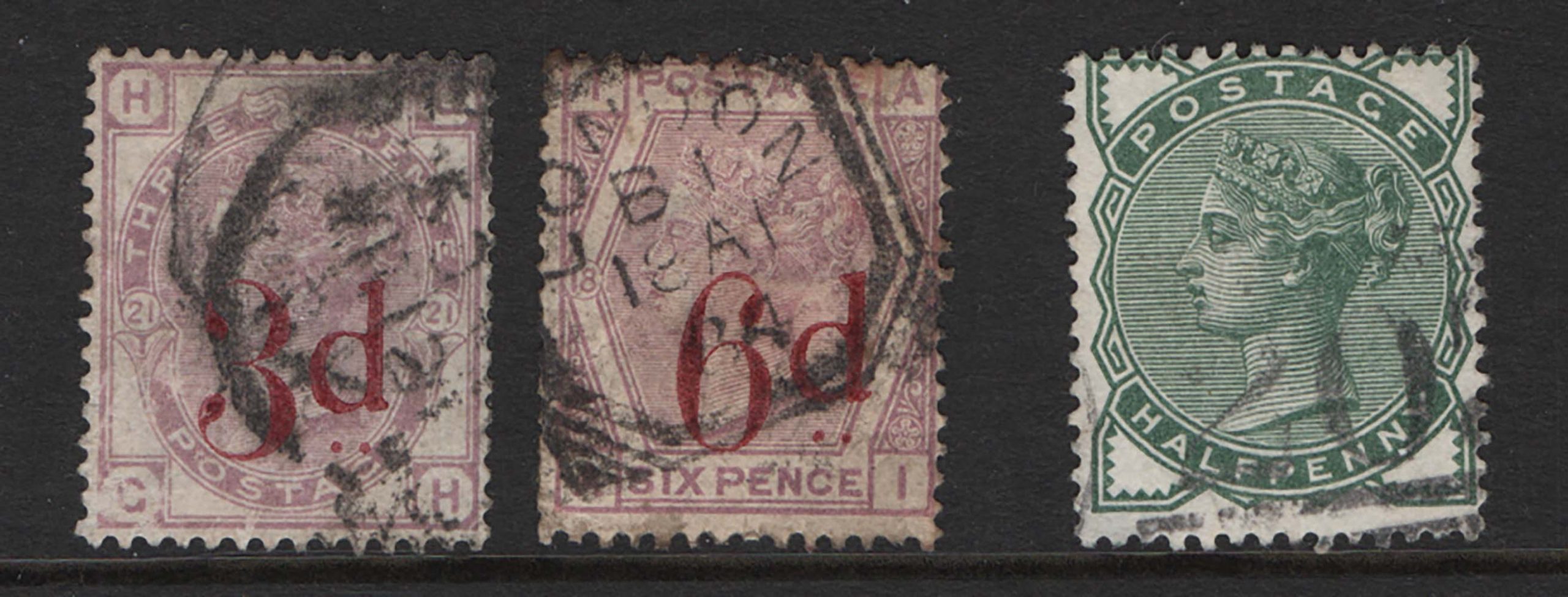 GB 1880 3d on 3d, sg159 good used, perfs a bit dulled at right cat £160, also 6d on 6d, sg162 perfs a bit dulled at lower left otherwise fine used cat £150 + ½d deep green sg164 very fine used, clear profile cat £22 [ref ebay/1208-a38 e4148]