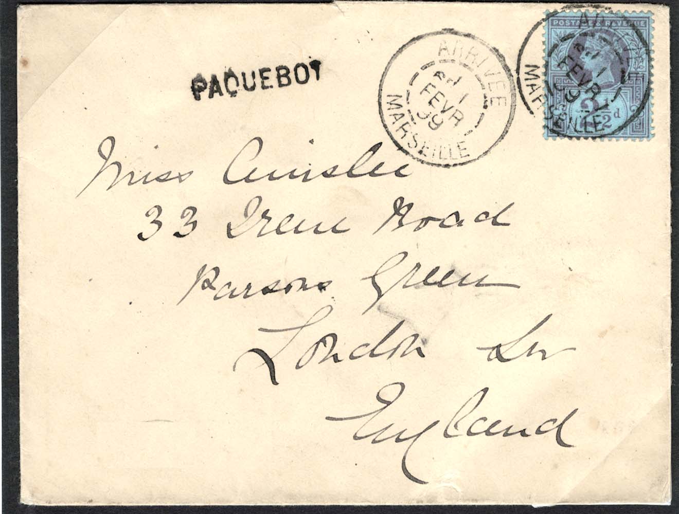GB 1887 2½d sg201 fu on neat 1889 cover to London, Paquebot, stamp cancelled Marseilles arrival cds