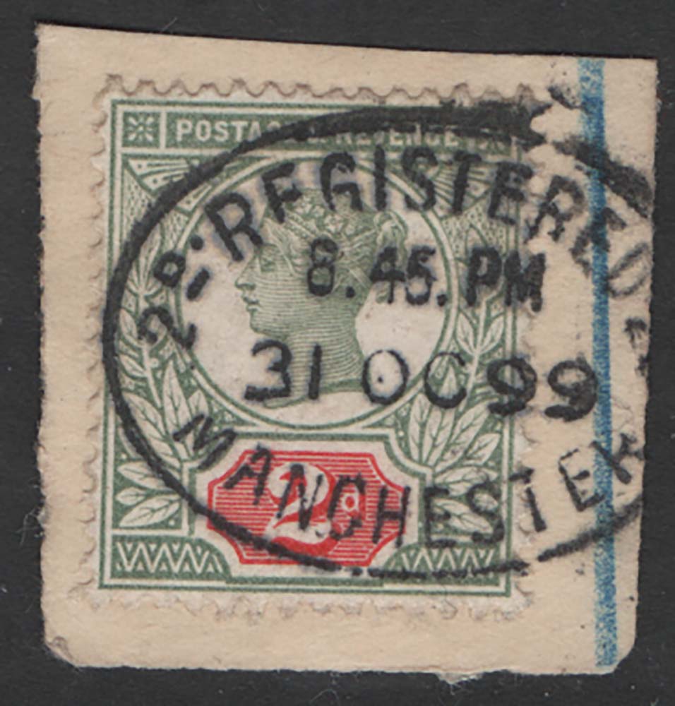 GB 1887 2d green & scarlet sg199 vfu on piece, neat reg oval c£260 [ref 286/sa/aa0439]