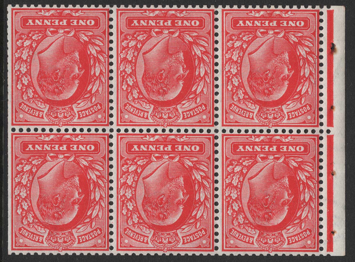 GB 1902 1d sg219 fine unmounted mint watermark inverted booklet pane of 6, perf E, good perfs ex trim at right, minor staple rust as usual cat £250 [ref 288/sa/ac0121] King Edward VII