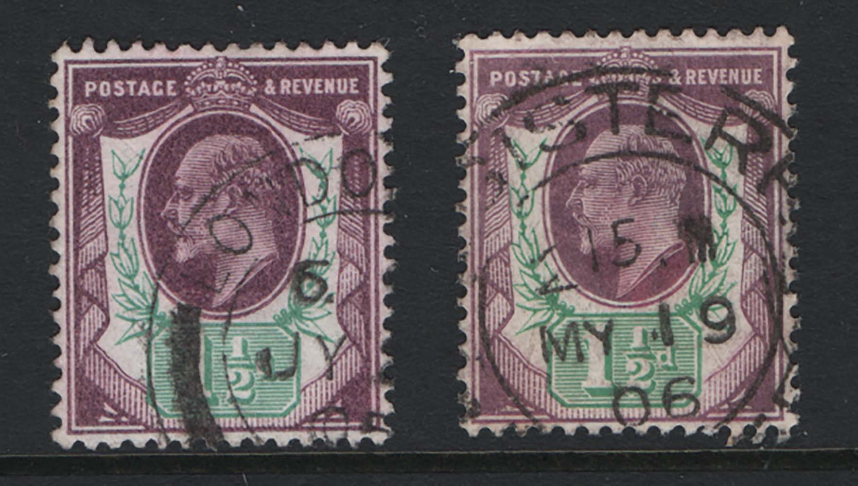 GB 1902 KEVII 1½d slate purple & green very fine used cds sg222 + 1½d slate purple & green chalky paper fine used cds sg224 cat £46 [ref ebay/1245-a55 e4460] 291/#411
