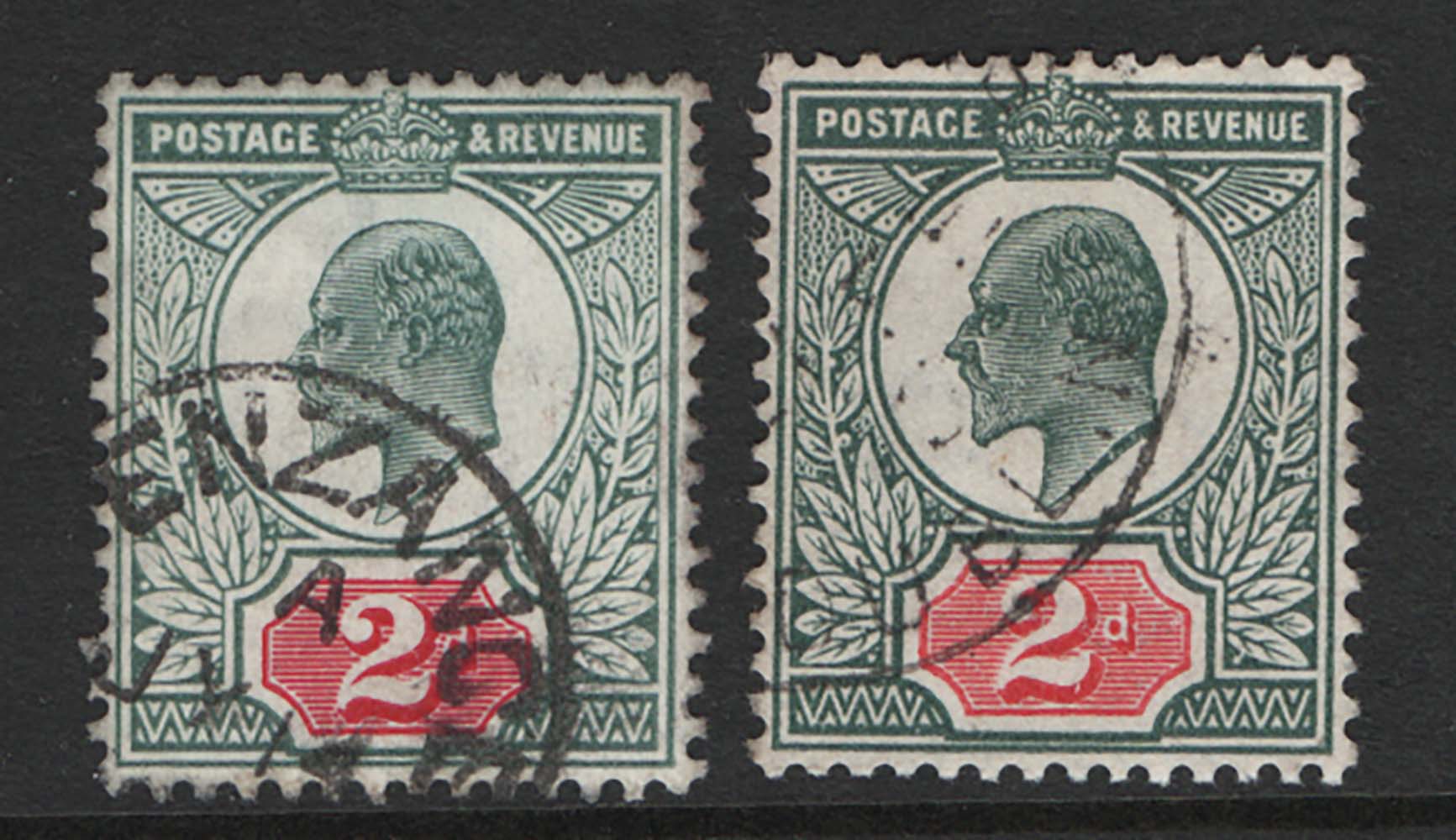 KEVII 2d pale grey-green & carmine-red chalky paper very fine used sg227 + 2d grey-green & scarlet chalky paper specialised shade Spec M12(4) very fine used sg228var cat £55