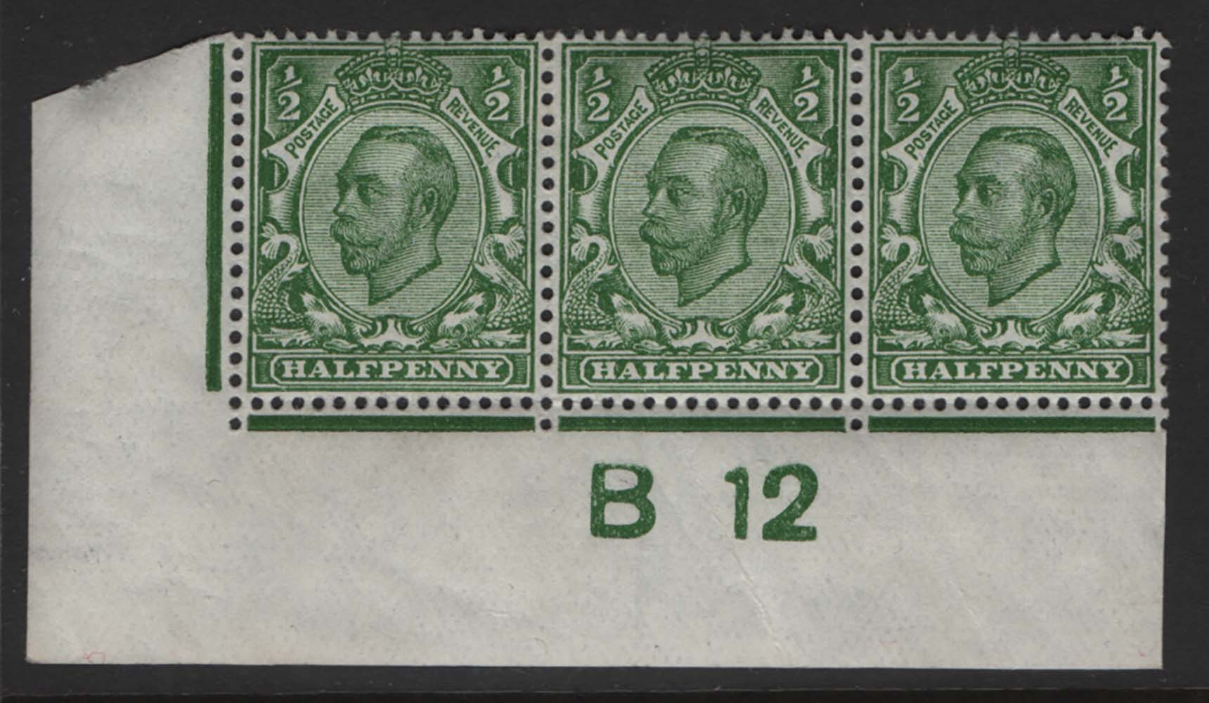 GB 1911 ½d die 2 deep green wmk crown B12(c) corner strip of 3, perf type 2, um sg338 c£84 as basic stamps [ref 286/sa/aa0606]