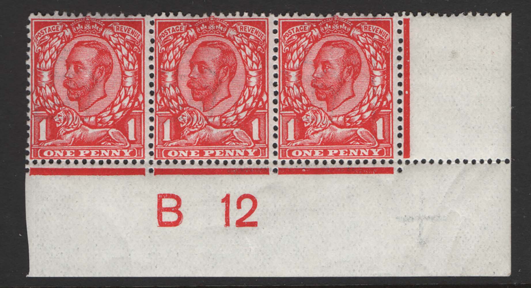 GB 1911 1d die 2 wmk crown deep bright scarlet B12w corner strip of 3, type 2A