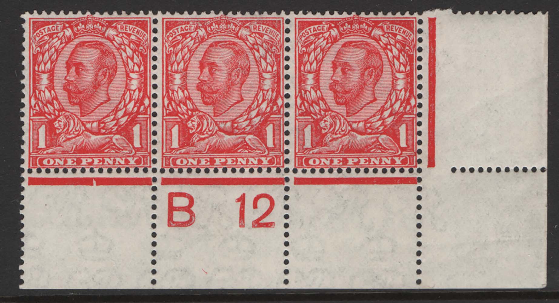 GB 1911 1d die 2 wmk multi-cypher B12w corner strip of 3, type 2 plate 12, stamps um sg350 c£75 as basic stamps