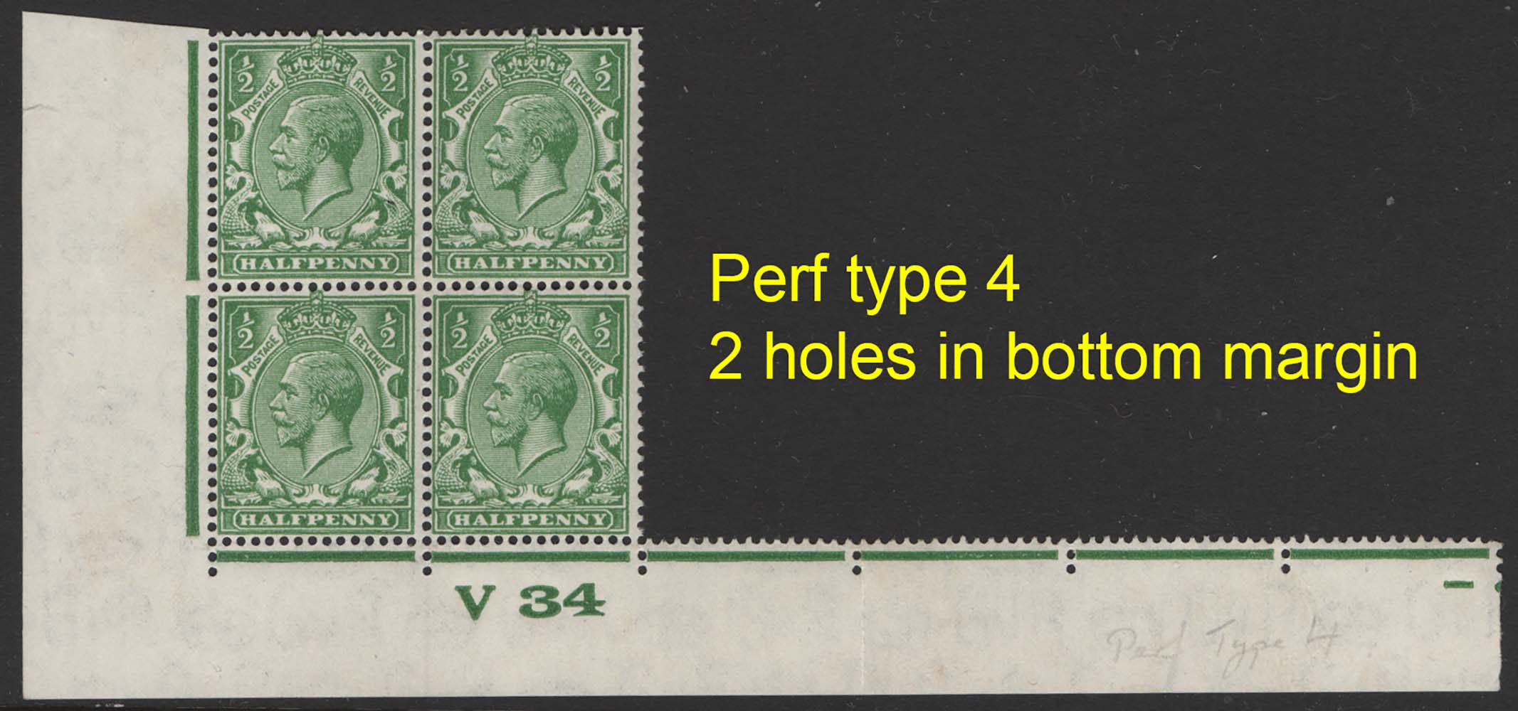 GB 1924 ½d sg418 V34 corner blk of 4 perf I2E (type 4) um, bottom margin extending to r20/6