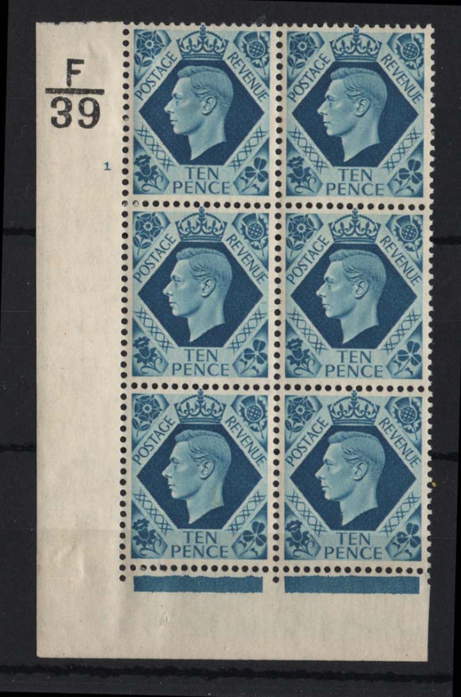 GB 1937 Dark colours 10d F39 cyl 1 no dot IE corner blk of 6, mint, dry gum c£90 [ref 287bb1107/sa/9w0227]