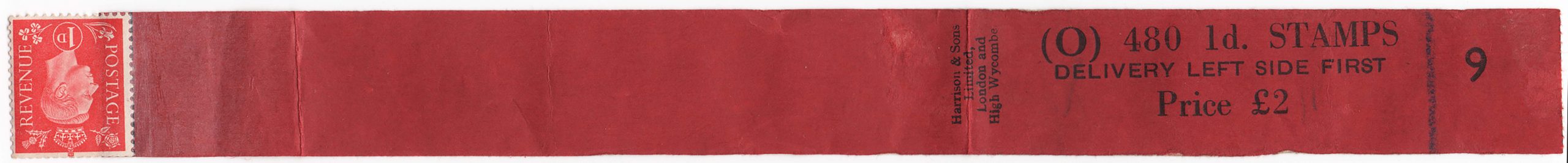 GB 1937 Dark colours 1d O480 coil leader in black on deep red, buff back #9 [ref 288/s/ac0440] King George VI