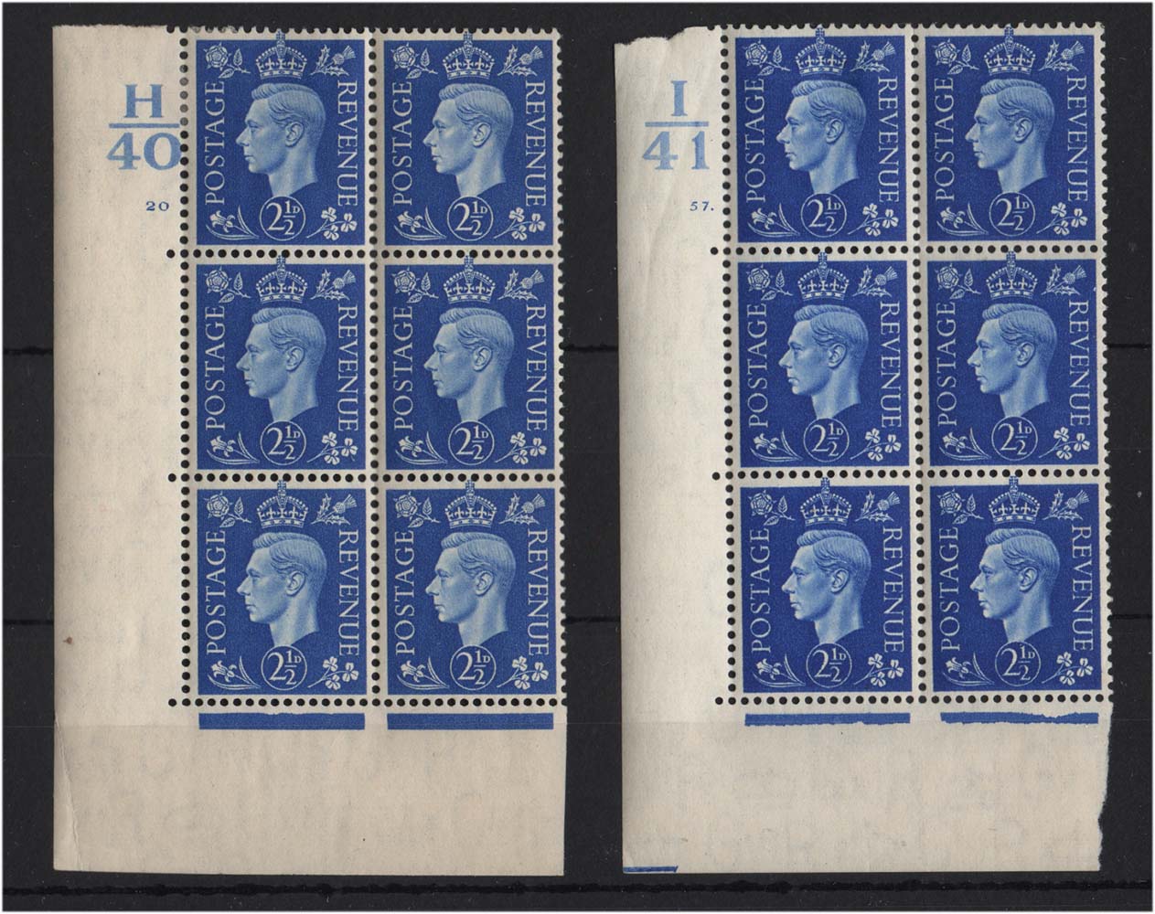 GB 1937 Dark colours 2½d cyl 20 no dot H40 corner blk of 6 f mint, ditto cyl 57 dot I41 c£55