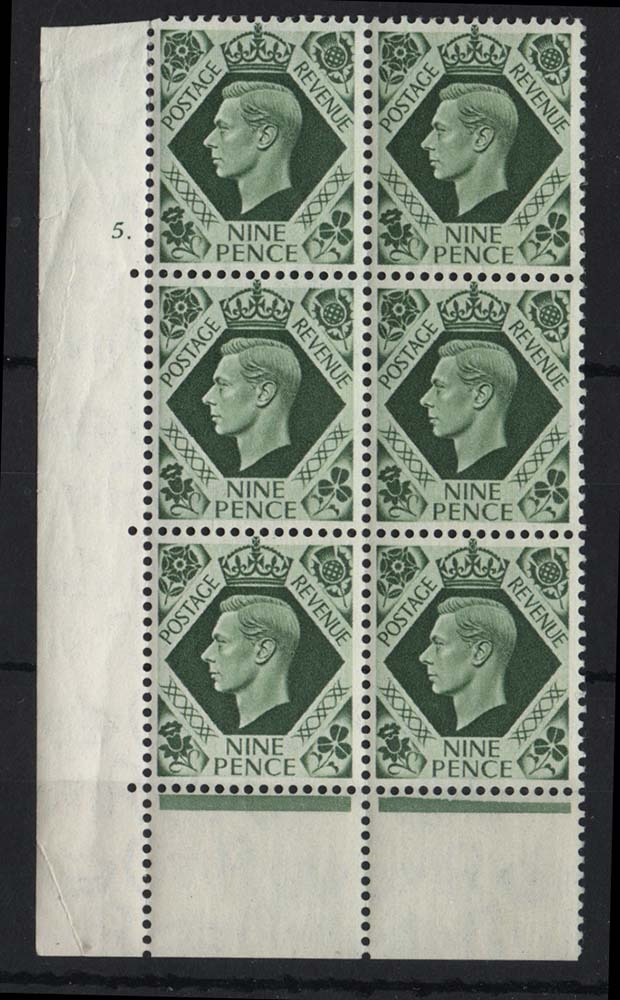 GB 1937 Dark colours 9d cyl 5 dot EP corner blk of 6, um, margin wrinkles c£80 [ref 287bb1122/sa/9w0226]