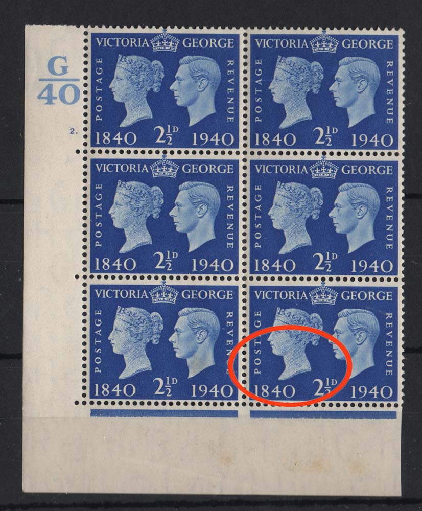 #0436 GB 1940 Centenary 2½d cyl 2 dot corner blk incl r20/2 retouched neck um