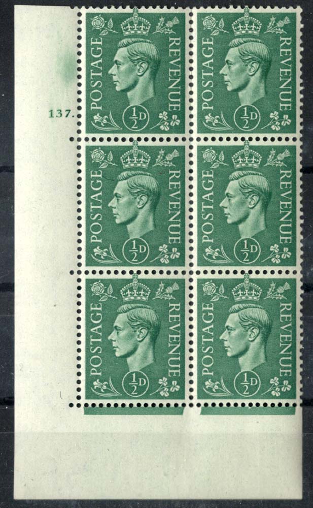 GB 1941 Light colours ½d cyl 147 dot corner block of 6 unmounted mint cat £40 [ref: 292/443 sa/9g0622]