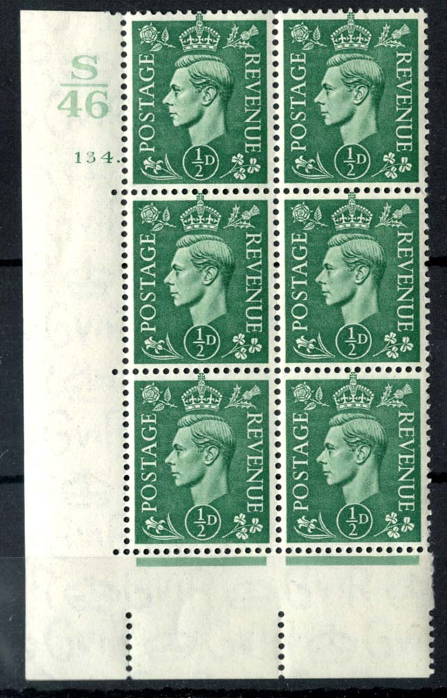 GB 1941 Light colours ½d S46 cyl 134 dot corner block of 6 fine mint cat £100 [ref: 292/447 sa/9g0621]