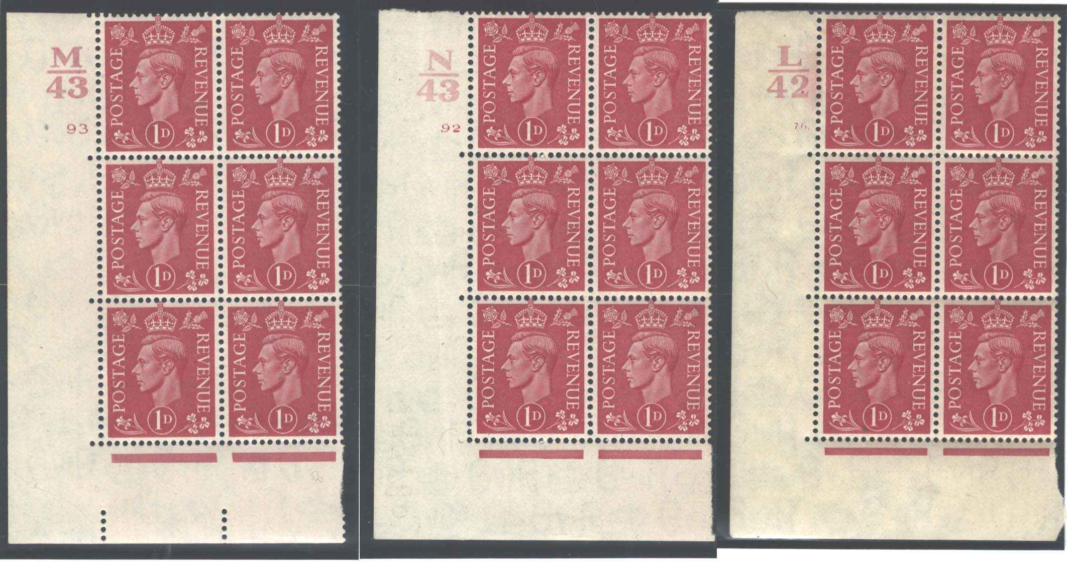 GB 1941 Light colours 1d L42 cyl 76 dot, M43 93 no dot, N43 92 no dot f mint c£38