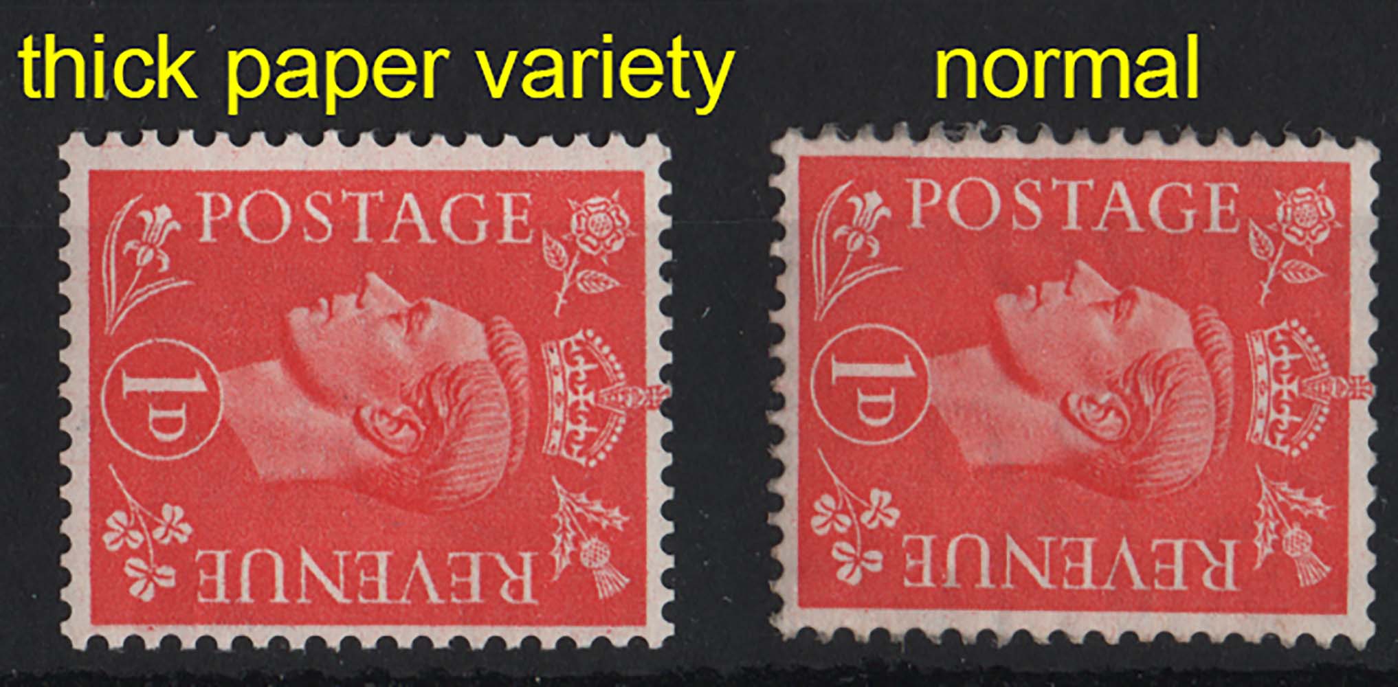 GB 1941 Light colours 1d wmk sideways, thick paper um Spec Q5b c£50 (+ normal paper for comparison) [ref 287bb1153/sa/9w0246]