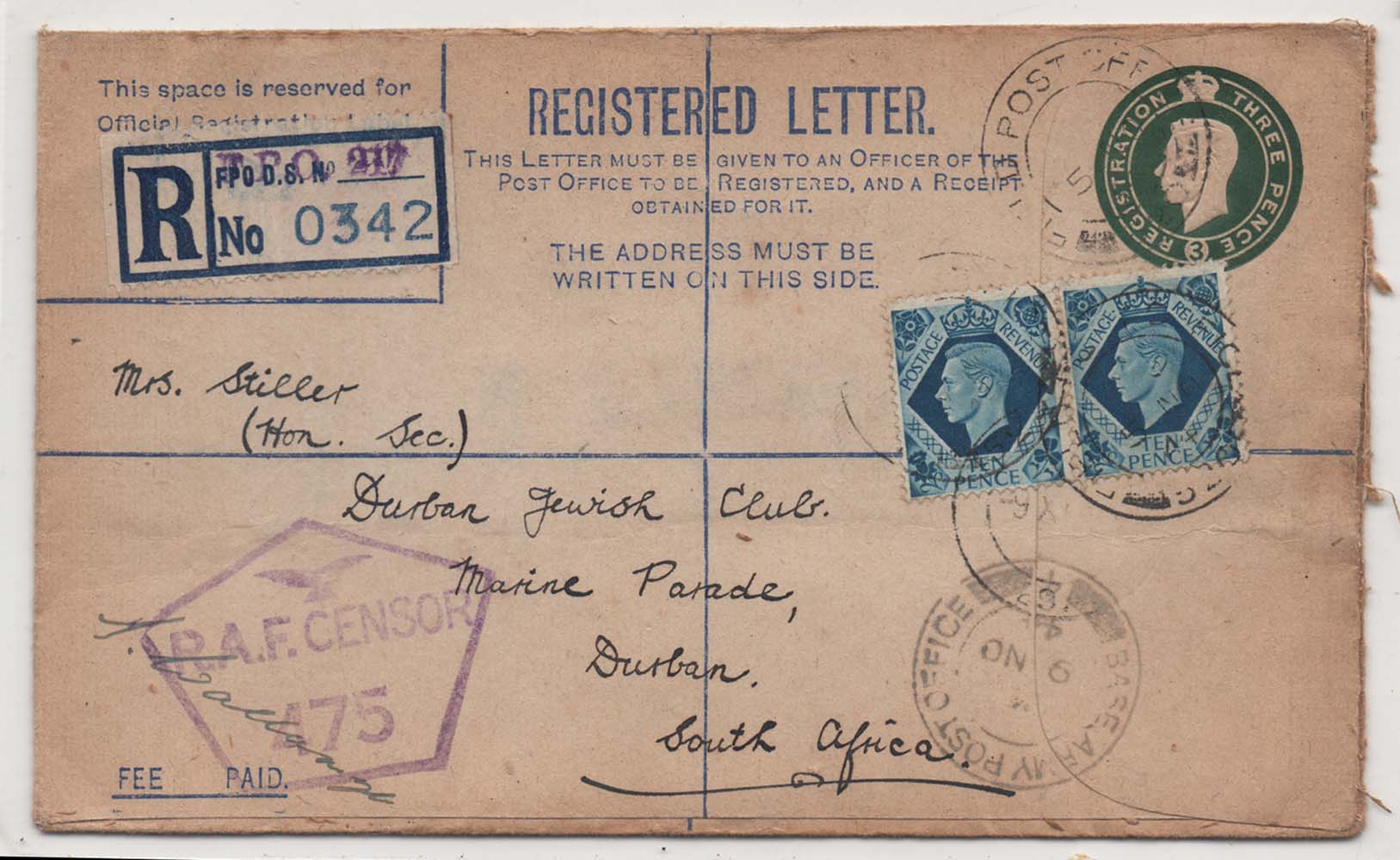 GB 1944 RAF Censored FPO reg envelope uprated pair 10d airmail to Durban [ref 287bb1172/se/9m0352]