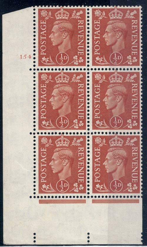 GB 1951 ½d r20/1 broken E of Revenue variety um cyl 154 blk of 6 um c£90