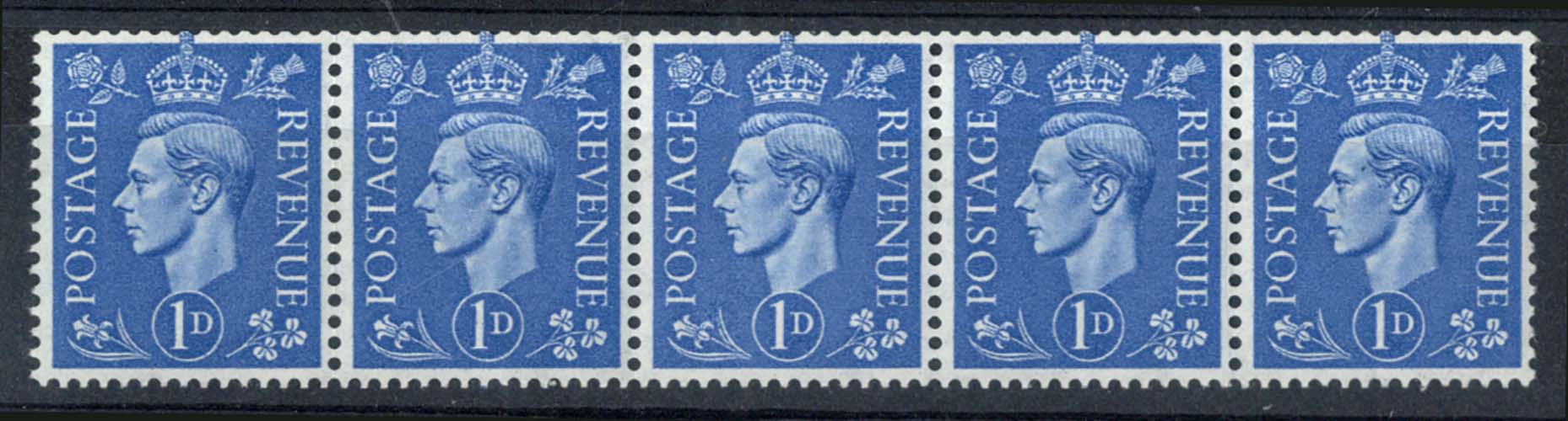 GB 1951 1d coil strip of 5 with retouched forehead & temple variety unmounted mint cat £75 [ref: 292/460 saE/9e0590]