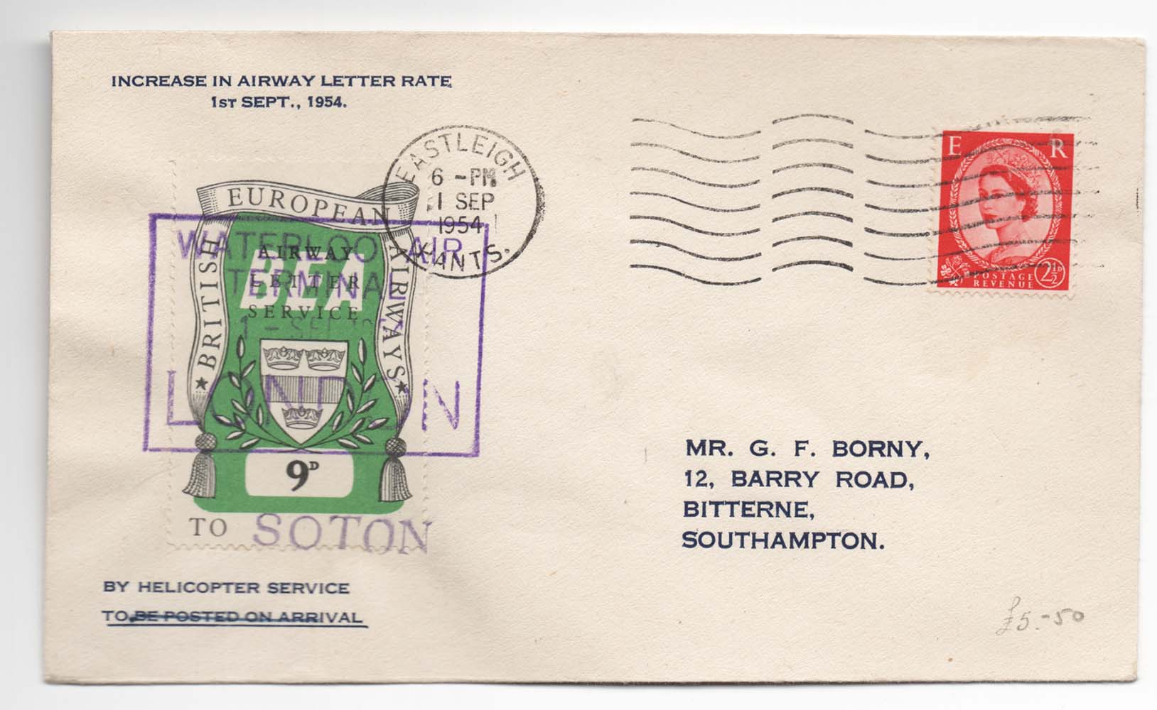 GB 1954 FFC BEA 9d label Waterloo Air Terminal to Southampton, Helicopter service [ref 287bb1212/bph1/9m0305]