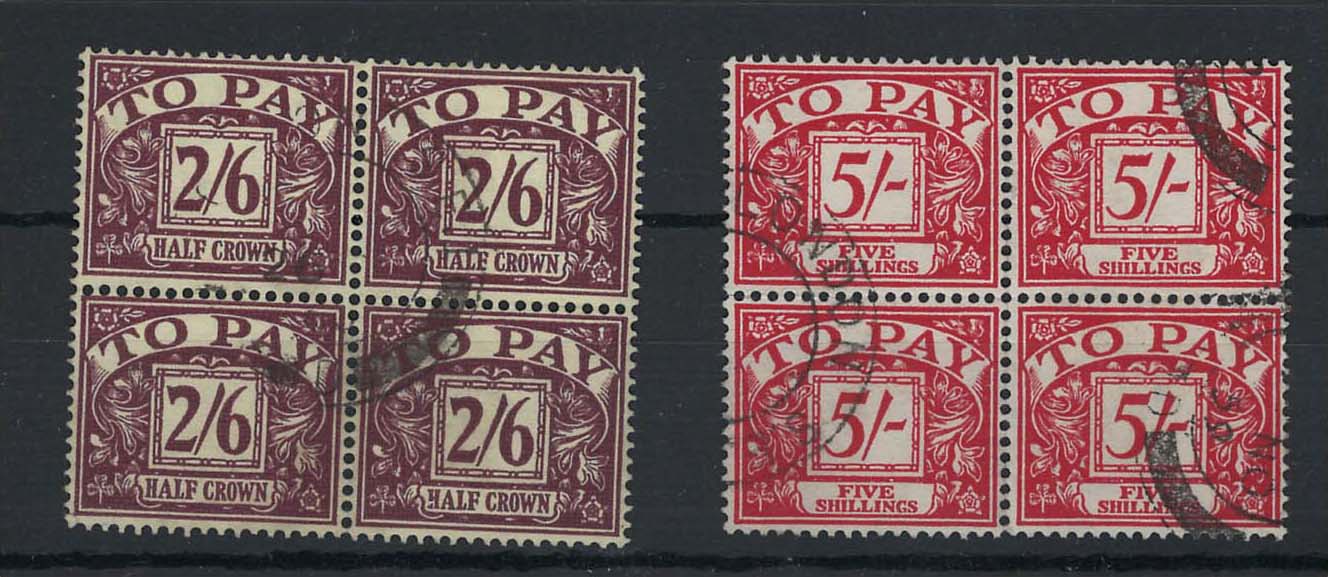 GB 1955 Edward Postage dues 2/6d, 5s very fine used blocks of 4 [ref: 292/474 sa/6c0355]
