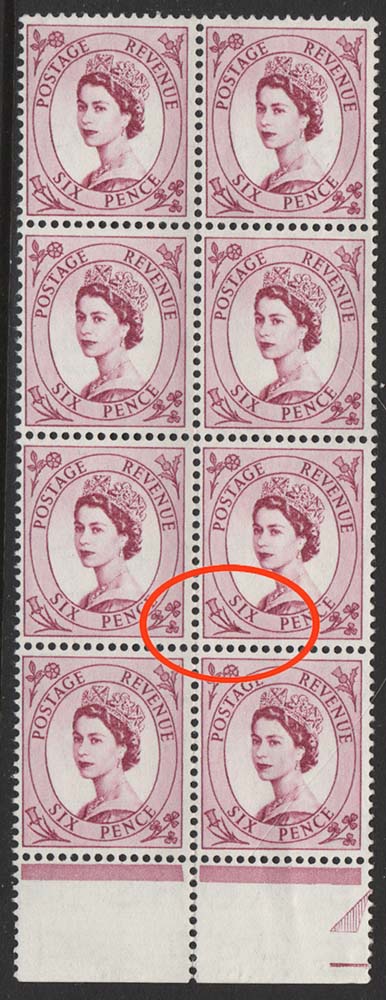 GB 1955 Edward watermark 6d claret cyl 3 r19/6 spot in daffodil stem unmounted mint positional block of 8 minor bend cat £36 [ref 288/sa/ac0694] Elizabeth II