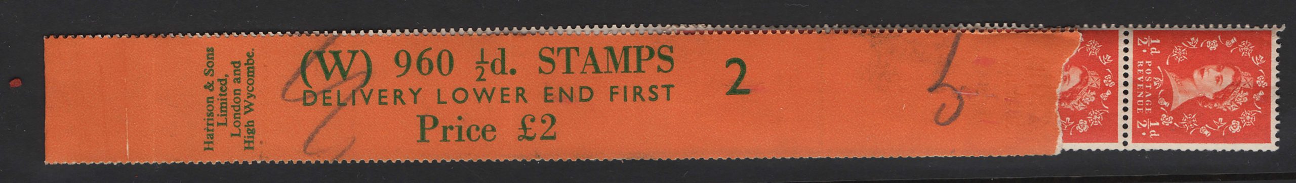GB 1958 ½d cream paper W960 coil leader #2 with 4 stamps attached – fine