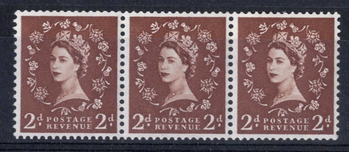 GB 1958 2d white paper retouched 2 variety very fine mint coil strip of 3 Spec S41c cat £30 [ref: 292/486 sa/9e0707]