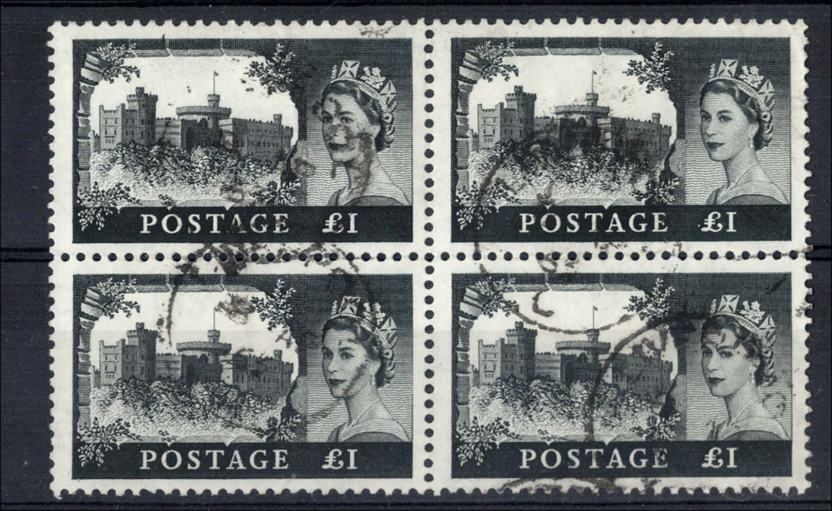 GB 1958 Castles 1st De La Rue £1 vfu cds blk of 4