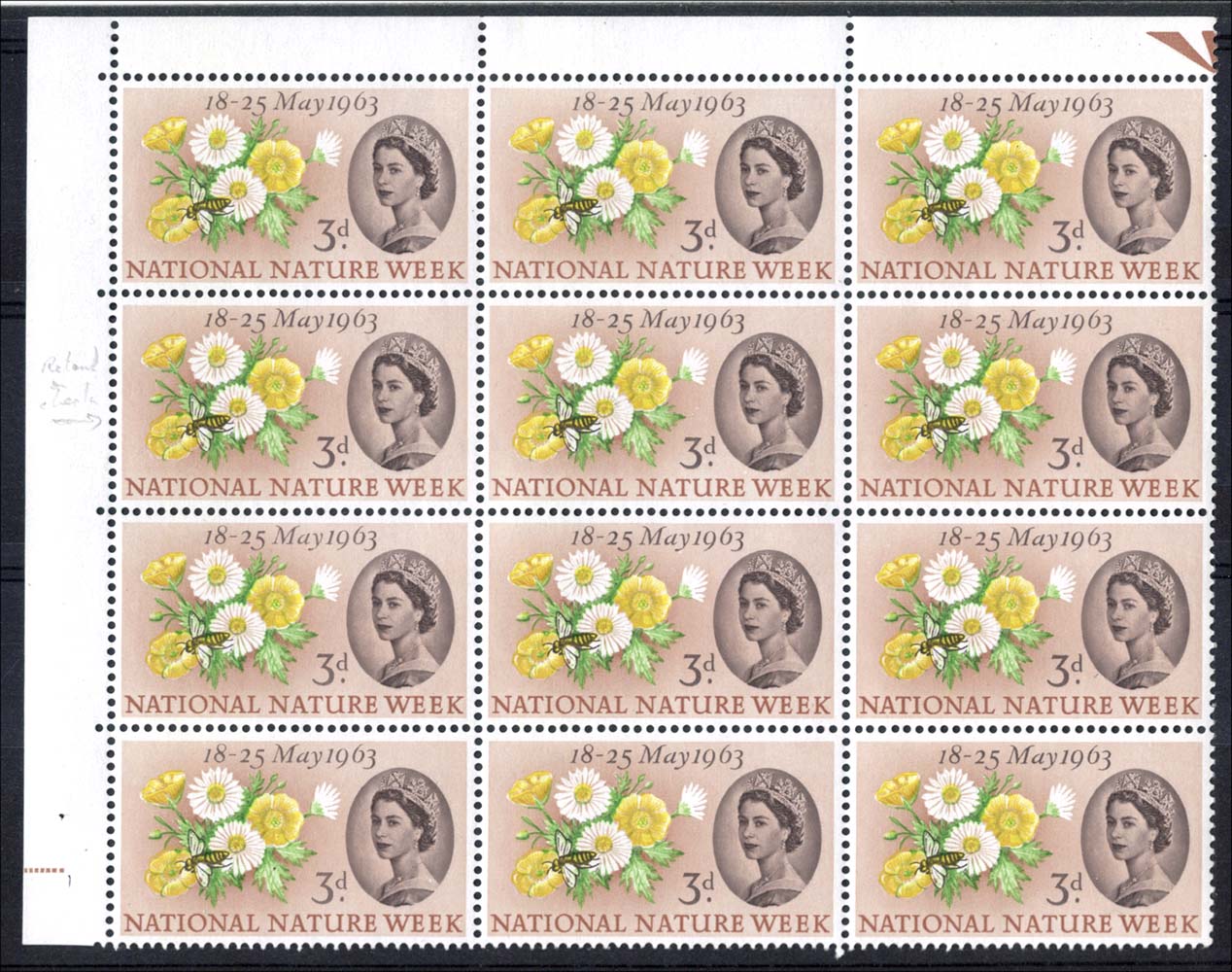GB 1963 Nature Week 3d r2/1 retouch on jaw SG-listed variety unmounted mint corner block of 12 [ref ebay/1220-a43 e4234] 291/#657
