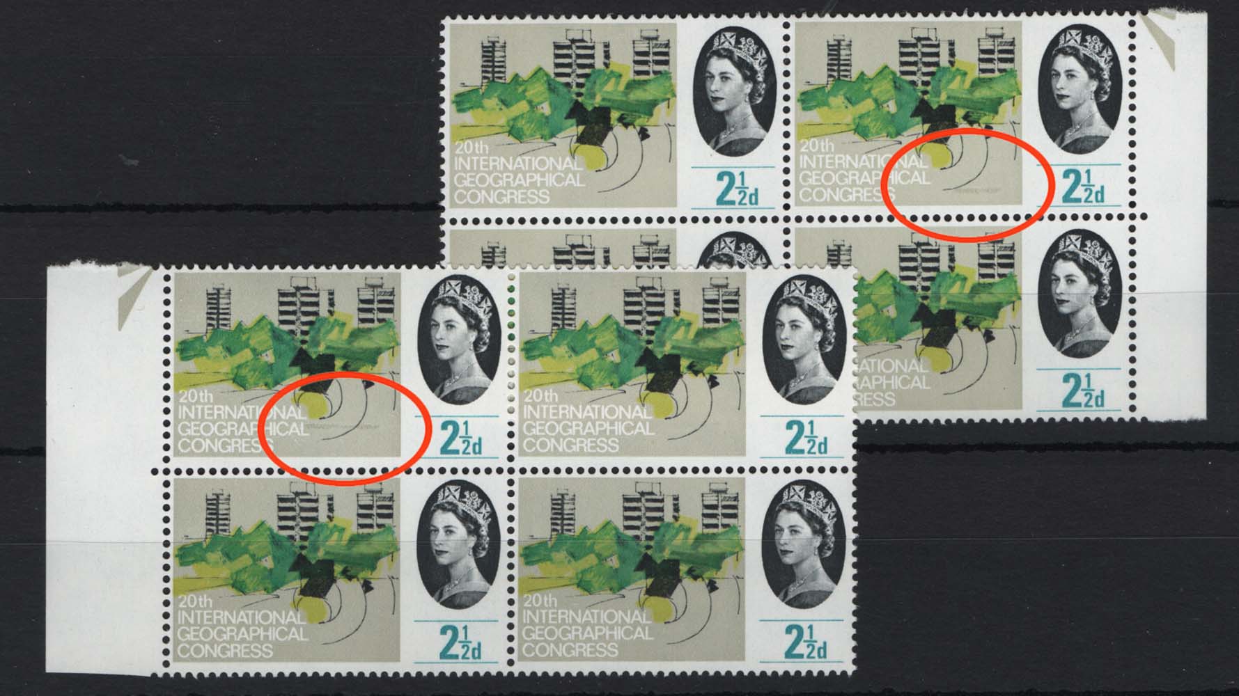 GB 1964 Geographical 2½d ord r11/1 retouched lawn variety um blk of 4, ditto r11/6 c£60 [ref 287bb1319/sa/9y0249]