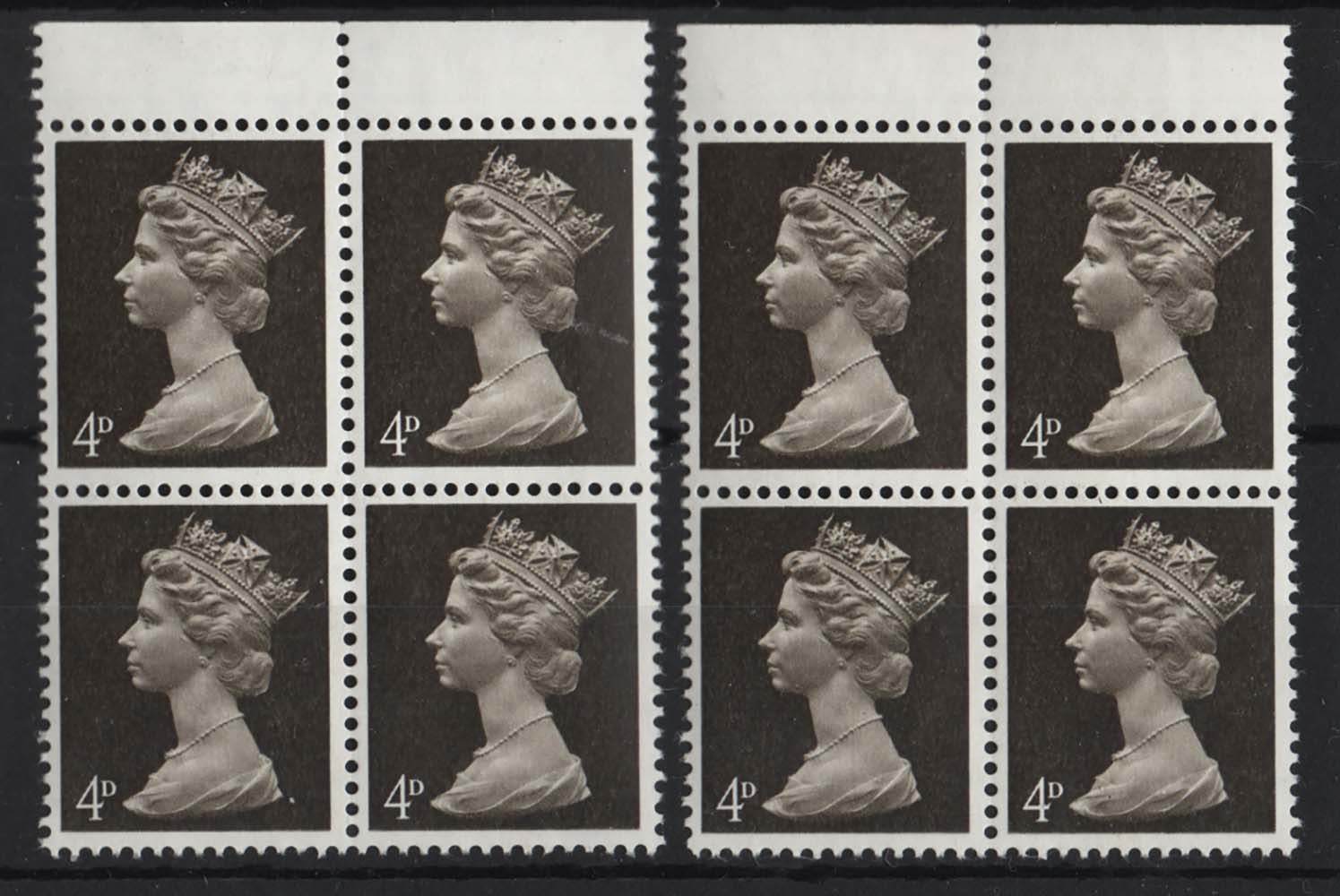 GB 1967 Machin 4d PVA missing phosphor 2x um blocks of 4 ?v slight shades c£32 [ref 287bb1367/sa/9q0413]