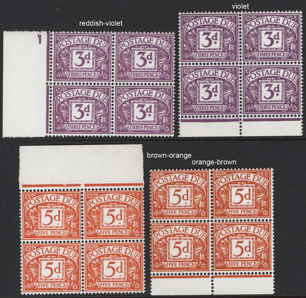GB 1968 No Wmk postage dues shade varieties: 3d reddish violet & violet um marginal blks of 4, ditto 5d orange-brown & brown-orange c£72 as normals