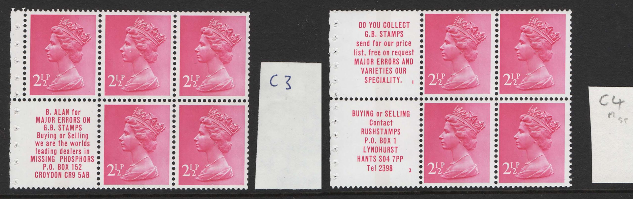 GB 1971 Machin 2½p B Alan booklet pane um good perfs, said to be ‘Bookmark’ listed variety C3, also 2½p booklet pane of 4 + 2 labels um good perfs, said to be ‘Bookmark’ listed variety C4