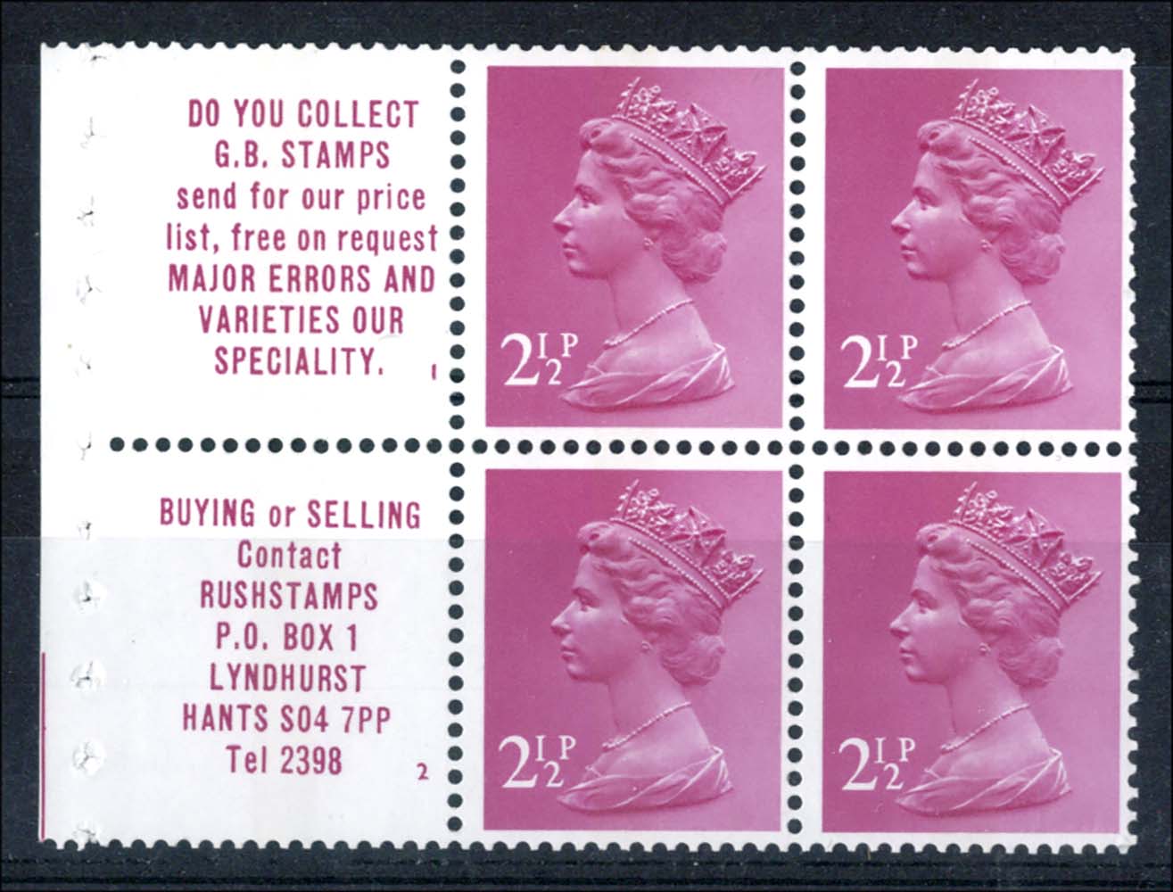GB 1971 Machin 2½p pane of 4 + 2 labels, blind AP perf, r1/1 missing serif to small 2, nice perfs um